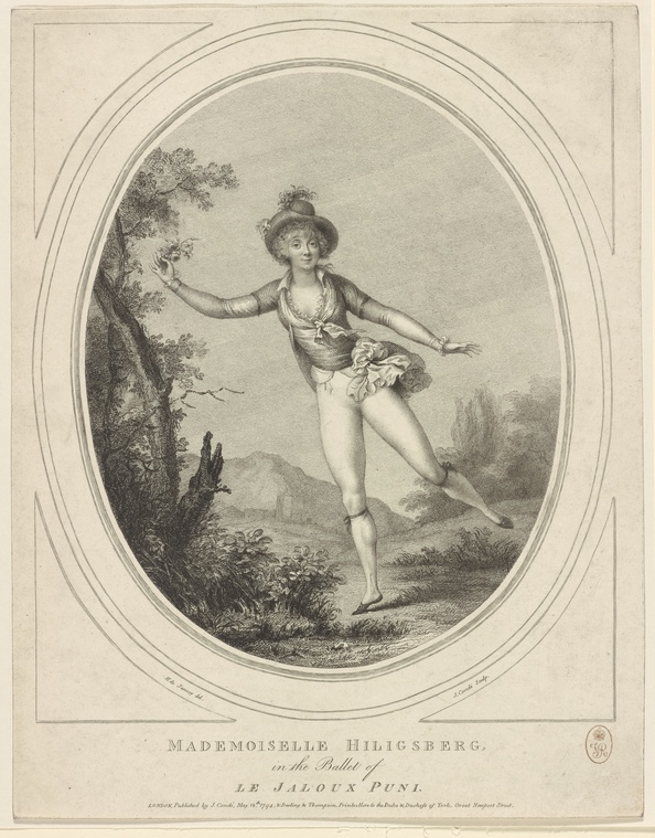 Mademoiselle Hilligsberg (her full name was most likely Marie-Louise Hilligsberg) was born around 1765-1770, and had trained under Gaétan Vestris (1729-1808), father of celebrated dancer Auguste Vestris (1760-1842). Her younger sister Janet was also a dancer, but as far as we know she was not as present at the King’s Theatre as Hilligsberg the elder, so the elder is most likely our dancer. She joined the King’s Theatre in 1787, becoming a celebrated soloist during the 1790s, before retiring and moving to France around 1803. She was particularly known for dancing trouser roles. She died in 1804.