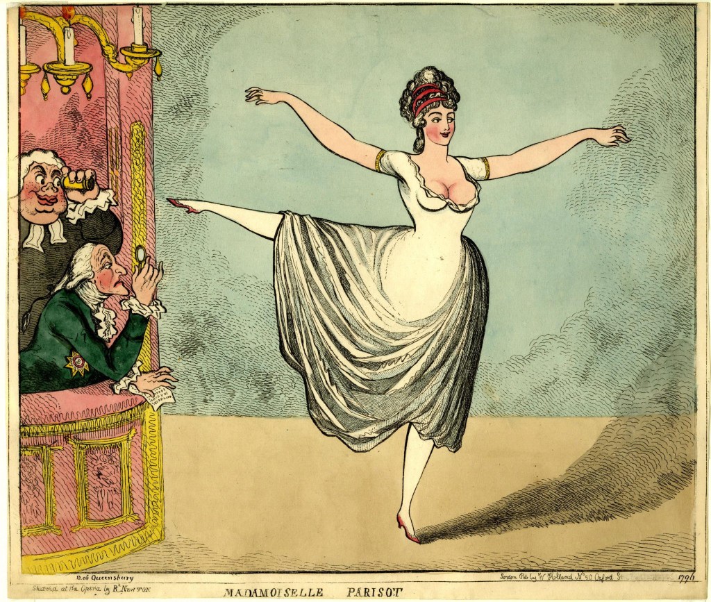 Mademoiselle Parisot (born c.1778) had danced in Rouen and Paris before making her way to London in 1796. She danced at the King’s Theatre and Drury Lane, and starred in some of Didelot’s other ballets. She was known for extending her legs higher than was the norm when doing steps like arabesques. A sketch by caricaturist Richard Newton shows Parisot dancing with her ‘scandalous’ leg extension, while being ogled at by two men. She left the stage around 1807, marrying a Mr Hughes.