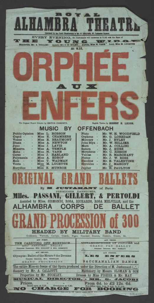 She was back in London by August dancing at the Metropolitan Music Hall, and spent the Winter season of 1872-1873 in Dublin, Ireland, playing Columbine in the Theatre Royal’s Harlequinade. This arrangement continued in 1873, where she spent most of the year at the Metropolitan and Winter in Dublin. Her next return to the Alhambra came in June 1875, this time to star in the new ballet Cupid in Arcadia.