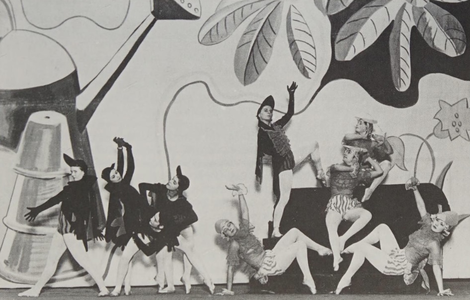 The Jackdaw and the Pigeons (de Valois), one of the ballets performed on the 5th May 1931. Beatrice is third from the left, crouching, and de Valois is stood posing on the stairs