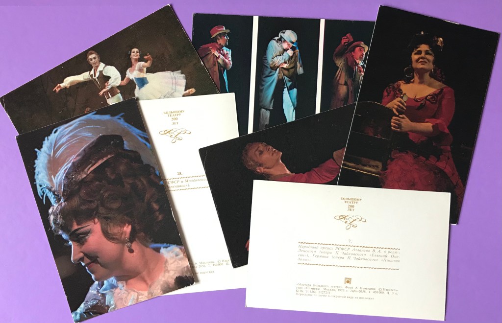 24 photocards of Bolshoi Ballet and Opera stars printed in 1976 to celebrate the bicentenary of the company’s founding. The photocards were published by Планета (Planet), a publishing house founded in 1969. Each photocard is numbered (my set is incomplete), and details the performers, the work and the photographer.